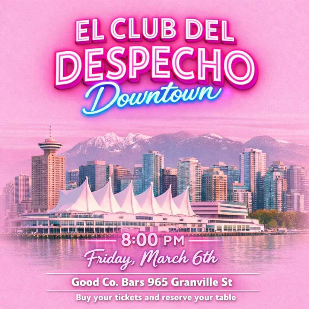 A night to sing with your soul, let go with drinks, and live the DESPECHO at Good Co. Granville St. 🎤 Sing, heal, and live it with your heart. El Club del Despecho takes over Granville St. An intense night filled with live music, real emotions, and that special energy that happens only when everyone sings together. Live Performances: 🎙️ The voices of Despecho that make every corner of the pub vibrate. 🎧 DJ TwoMonkey — setting the mood before and after the live show with those iconic anthems we all end up singing and dancing to with our hearts wide open. 💔 A night for brave hearts If you’ve ever toasted to love, cried to a song, or laughed between drinks and friends — this night is for you. At Despecho Night, every song is a story, every verse a release, and every chorus a shared therapy to sing, heal, and celebrate together. 📍Venue: Good Co. – Granville St, Vancouver 🕗With this ticket. Early access from 8:00 to 8:30 PM with your Eventbrite tickets ⚠️Once you have your tickets, if you’d like to make a reservation, send us a message via Instagram DM. Tables are assigned on a first-come, first-served basis as reservations are made. 🔞 19+ event